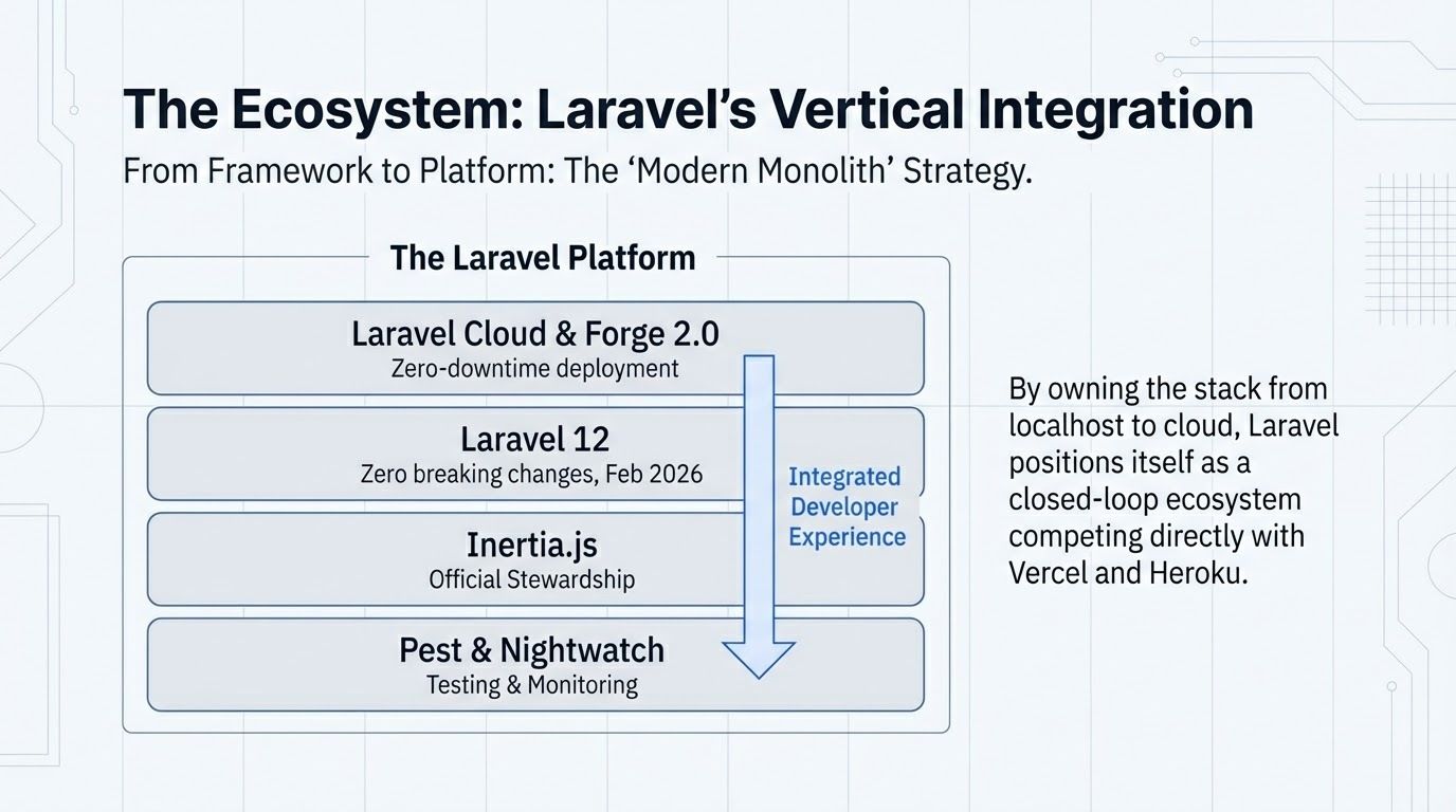 Context: Laravel took over stewardship of Inertia.js, solidifying "Modern Monolith" strategy. Laravel Cloud, Forge 2.0, Nightwatch create vertically integrated platform. Laravel 13 expected Q1 2026 with likely deeper PHP 8.5/8.6 feature integration.