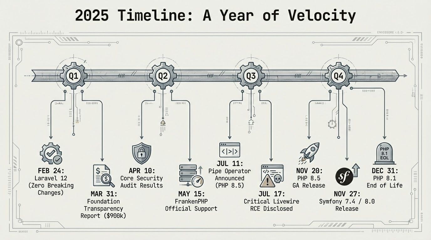 Laravel and Symfony executed vertical integration strategies: Laravel 12 launched with zero breaking changes alongside Laravel Cloud and Nightwatch monitoring, while Symfony released 7.4 LTS and 8.0 simultaneously with identical features but diverging support paths. Security defined the year's challenges: Livewire's critical RCE (CVE-2025-54068, CVSS v4.0 9.2 / v3.1 9.8) with 130,000+ public Livewire instances detected (vulnerable subset depends on version/configuration), while 600+ Laravel apps were exposed via leaked APP_KEY values on GitHub. The PHP Foundation commissioned its first security audit in over a decade, managed an $900,000 budget with 10 part-time/full-time developers, and began searching for its first full-time Executive Director.