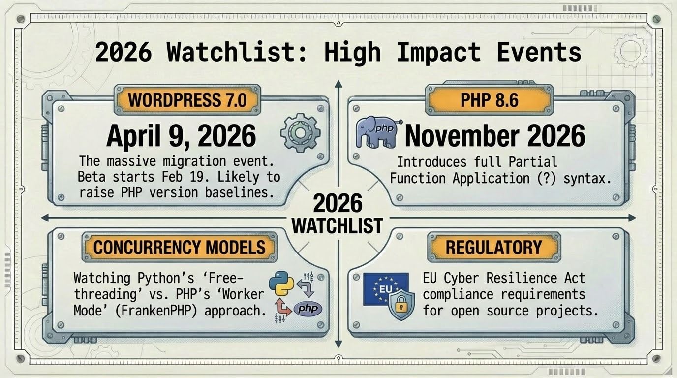 Dec 31 — PHP 8.1 reached end of life after 4 years. Major hosting providers forced automatic upgrades to PHP 8.4. Triggered massive Q3/Q4 migration effort.