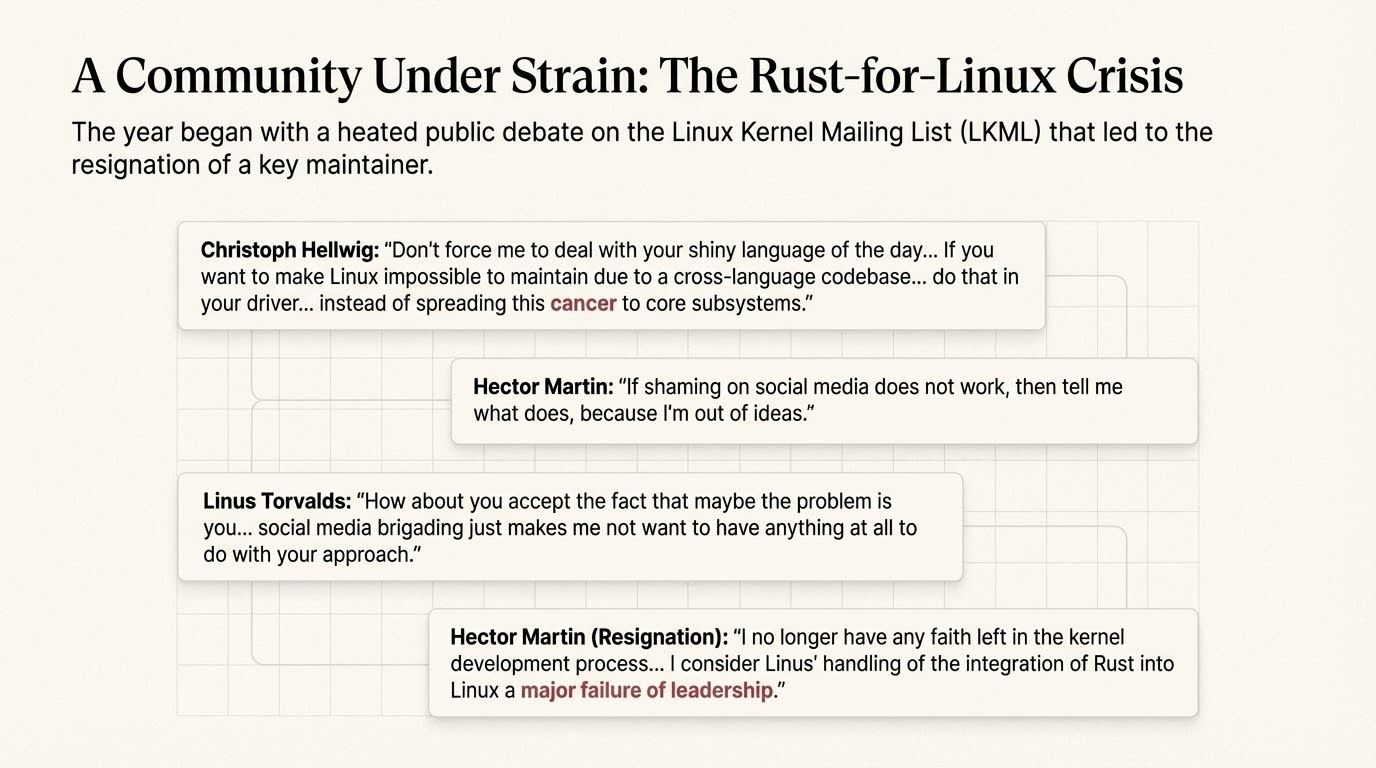 The integration of Rust into the Linux kernel faced significant community friction in early 2025, culminating in two high-profile resignations—before ultimately achieving official permanence by year's end.