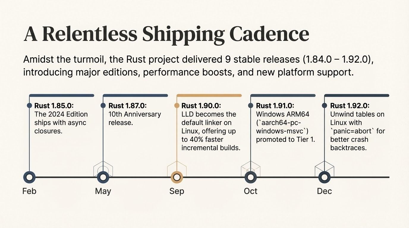 December 11 — Rust 1.92.0 released with never type (!) lints deny-by-default, minimum external LLVM updated to 20, and unwind tables on Linux with panic=abort for better crash backtraces.