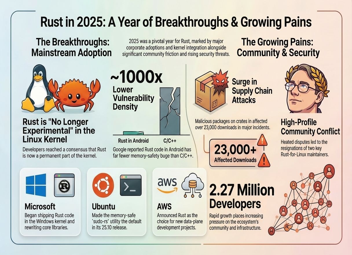 Two milestones bookended Rust's 2025: Rust 1.85.0 shipped the 2024 Edition in February with async closures and lifetime capture fixes, and in December the Linux kernel maintainers declared Rust "no longer experimental". Between these events, a Microsoft Distinguished Engineer set a goal to eliminate all C/C++ by 2030, Google reported ~1000x lower memory-safety vulnerability density in Android's Rust vs C/C++ code, and Ubuntu made sudo-rs the default in 25.10.