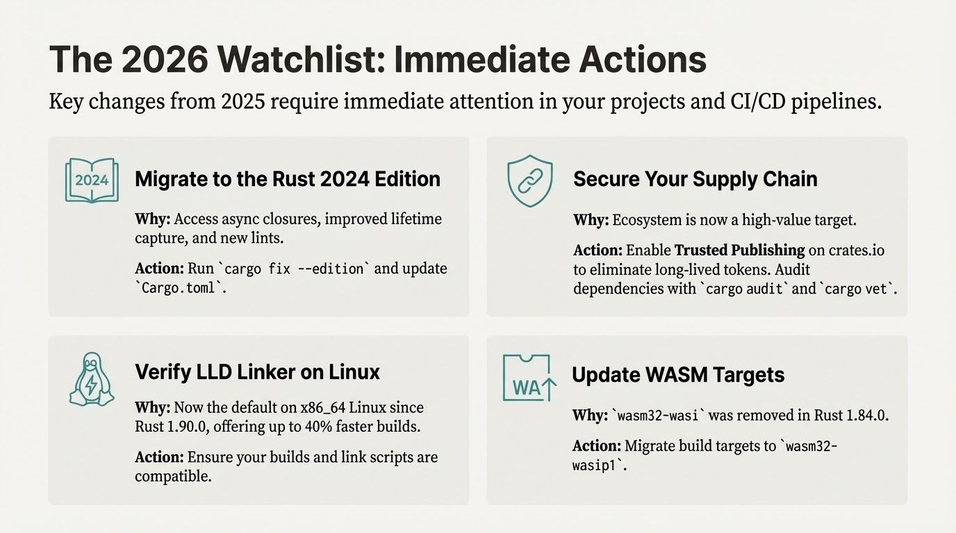 Actions for 2026: migrate to the Rust 2024 Edition, enable Trusted Publishing on crates.io, and evaluate the LLD linker for faster builds on Linux.