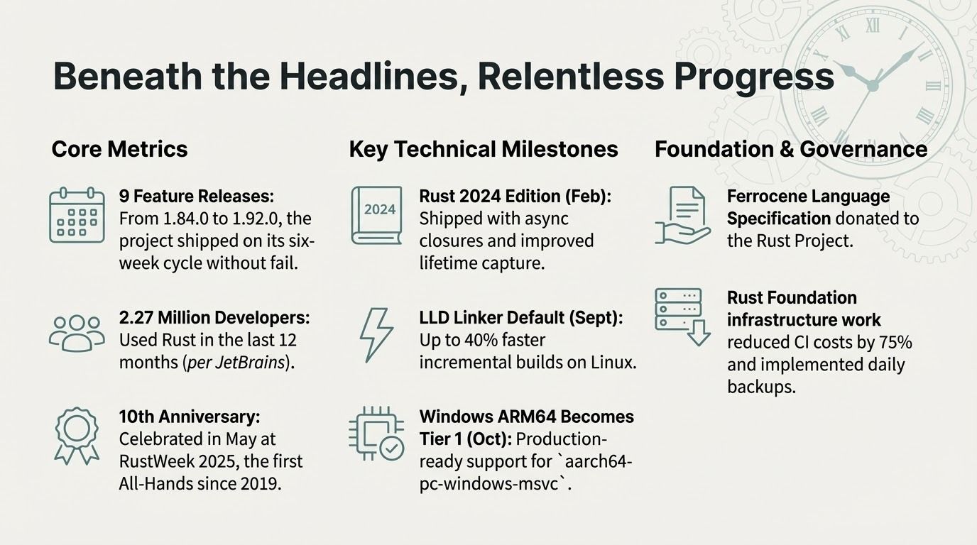 The year tested community resilience. The Rust-for-Linux project faced its second major resignation in six months when Hector Martin resigned from Asahi Linux after a heated mailing list exchange with Linus Torvalds over "social media brigading"—following Wedson Almeida Filho's August 2024 departure over "nontechnical nonsense". Supply chain attacks hit crates.io repeatedly—typosquatting malware and OS-specific payloads in Web3 crates affecting 23,000+ downloads across the two largest incidents, plus a later exfiltration attempt and phishing campaigns targeting crate publishers. The Rust Foundation Maintainers Fund announcement prompted questions over undisclosed fund size and eligibility details. Through it all, Rust shipped 9 feature (.0) releases (1.84.0–1.92.0), crossed 2.27 million developers per JetBrains, and remained the most admired language in Stack Overflow's 2025 survey—every year since 1.0 in 2015. Behind the scenes, the Rust Foundation's infrastructure work kept releases flowing: 75% CI cost reduction, out-of-band daily backups for critical assets, and a full-time project manager.