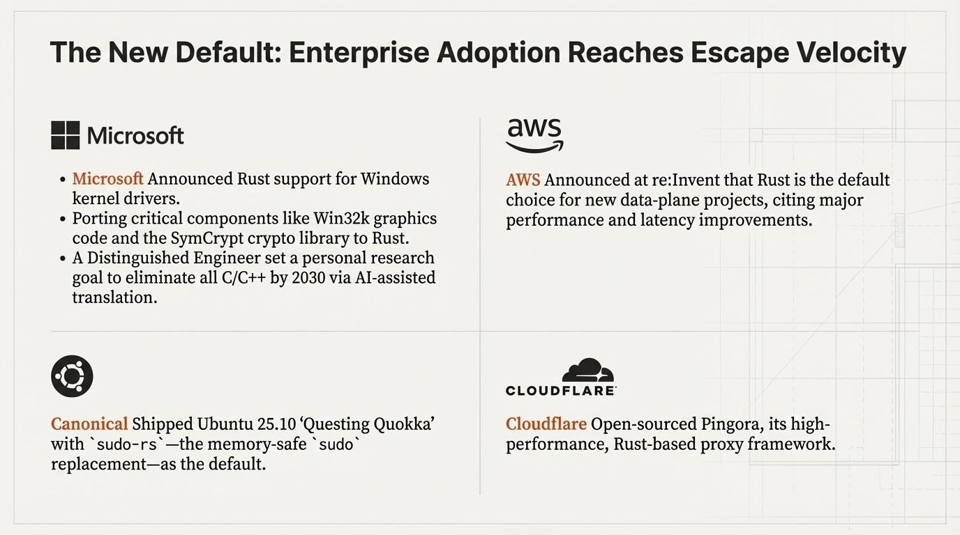 Microsoft: "Year of Rust." Win32k graphics code being ported to Rust, with GDI region code already shipping. SymCrypt cryptographic library rewrite in progress with formal verification. Hyperlight VM startup in 1–2ms. A Distinguished Engineer set a personal goal to eliminate all C/C++ by 2030—a research project, not official company policy.