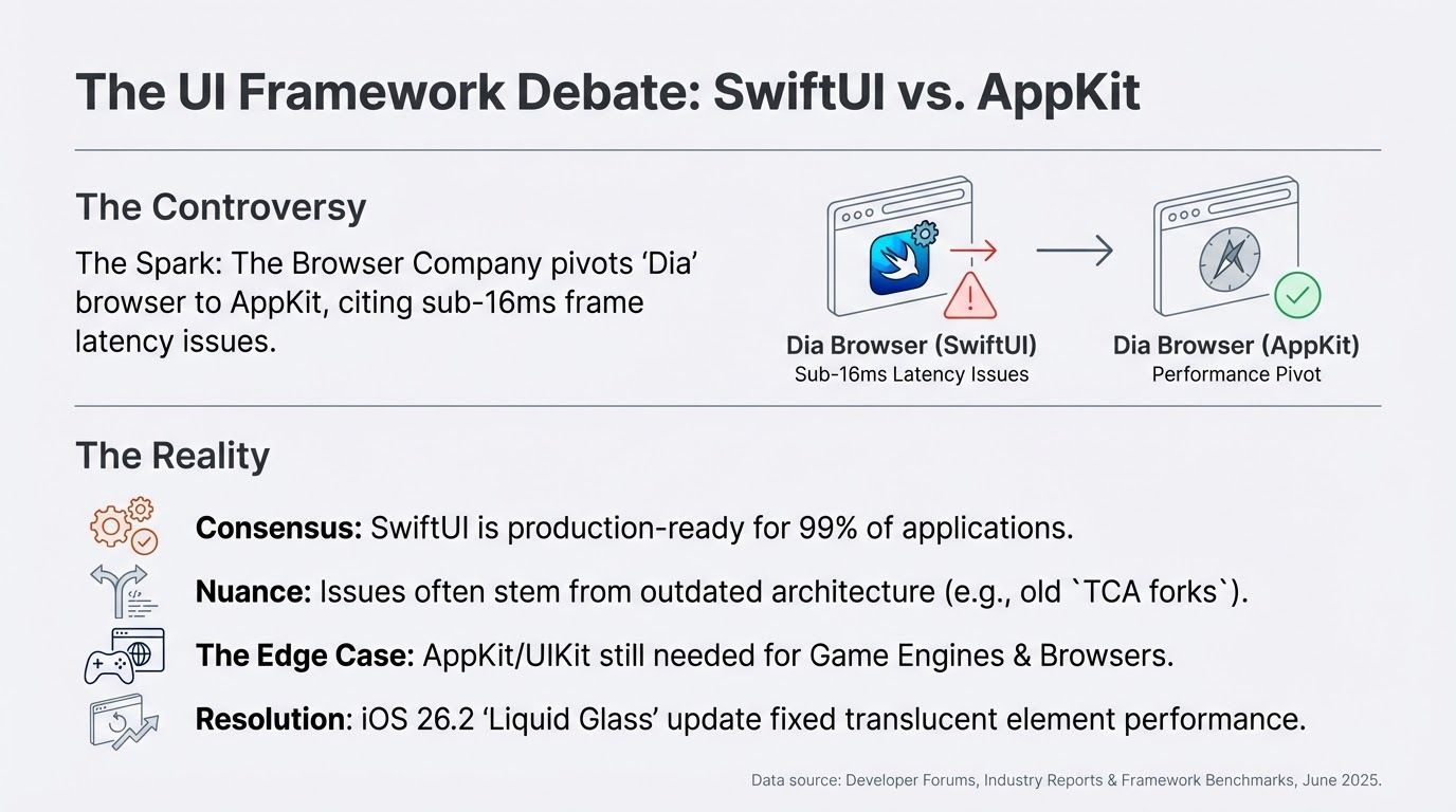The Browser Company's pivot from SwiftUI to AppKit for their Dia browser sparked intense debate. They cited latency, hitching, and CPU overhead for sub-16ms frame time requirements. Community analysis suggested implementation issues (outdated TCA fork, improper state management) rather than framework limitations. Consensus: SwiftUI is production-ready for most apps; AppKit/UIKit remain essential for extreme performance (browsers, games, creative tools). iOS 26.2 improved Liquid Glass performance significantly.